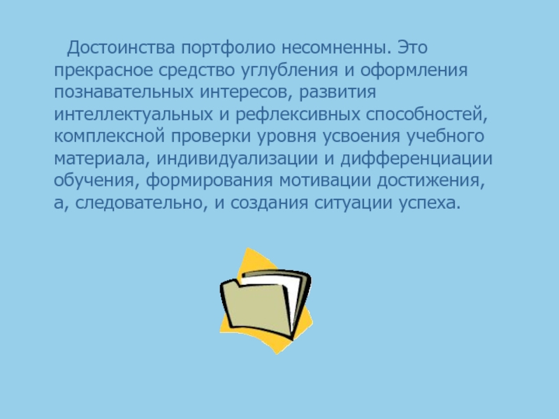 Слайд 12 Достоинства портфолио несомненны. Это прекрасное средство углубления