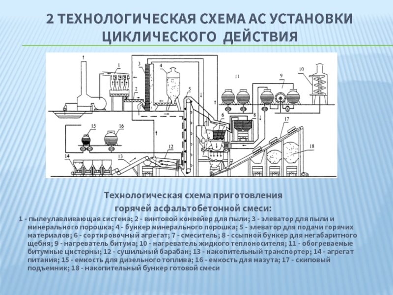 1 - пылеулавливающая система; 2 - винтовой конвейер для пыли; 3 - элеватор для пыли и минерального порошка; 4 - бункер минерального порошка; 5 - элеватор для подачи горячих материалов; 6 - сортировочный агрегат; 7 - смеситель; 8 - ссыпной бункер для негабаритного щебня; 9 - нагреватель битума; 10 - нагреватель жидкого теплоносителя; 11 - обогреваемые битумные цистерны; 12 - сушильный барабан; 13 - накопительный транспортер; 14 - агрегат питания; 15 - емкость для дизельного топлива; 16 - емкость для мазута; 17 - скиповый подъемник; 18 - накопительный бункер готовой смеси