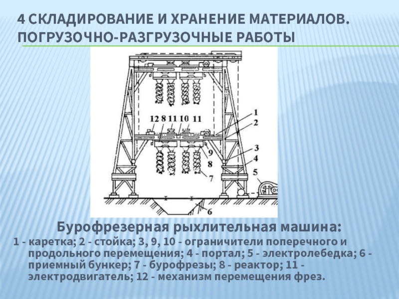 2 - стойка; 3, 9, 10 - ограничители поперечного и продольного перемещения; 4 - портал; 5 - электролебедка; 6 - приемный бункер; 7 - бурофрезы; 8 - реактор; 11 - электродвигатель; 12 - механизм перемещения фрез.