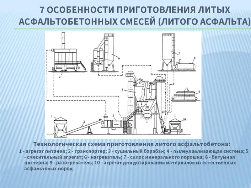 1 - агрегат питания; 2 - транспортер; 3 - сушильный барабан; 4 - пылеулавливающая система; 5 - смесительный агрегат; 6 - нагреватель; 7 - силос минерального порошка; 8 - битумная цистерна; 9 - разогреватель; 10 - агрегат для дозирования материалов из естественных асфальтовых пород