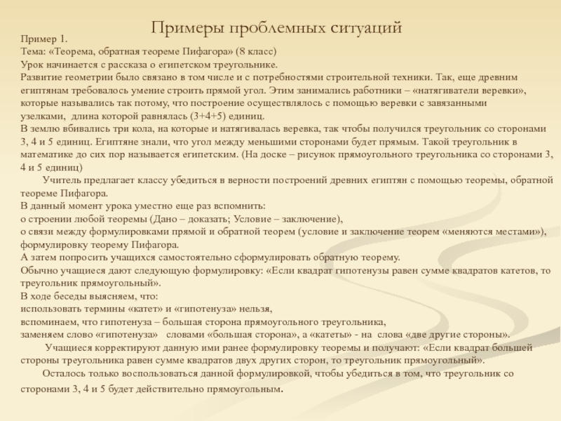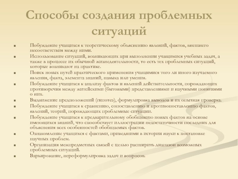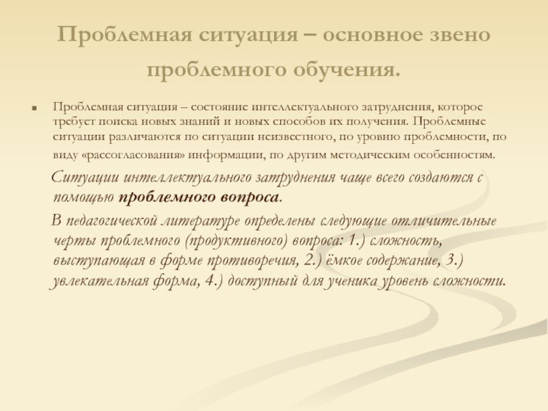 интеллектуального затруднения, которое требует поиска новых знаний и новых способов их получения. Проблемные ситуации различаются по ситуации неизвестного, по уровню проблемности, по виду «рассогласования» информации, по другим методическим особенностям.