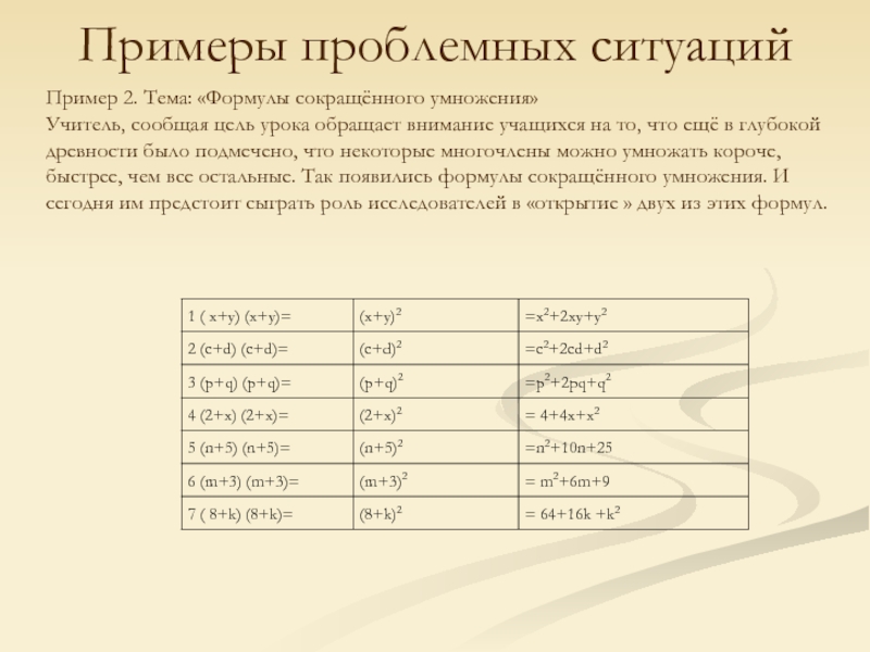 обращает внимание учащихся на то, что ещё в глубокой древности было подмечено, что некоторые многочлены можно умножать короче, быстрее, чем все остальные. Так появились формулы сокращённого умножения. И сегодня им предстоит сыграть роль исследователей в «открытие » двух из этих формул.