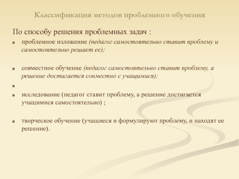 творческое обучение (учащиеся и формулируют проблему, и находят ее решение).