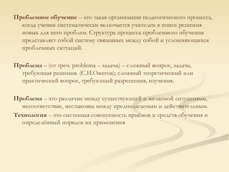 Проблема – (от греч. problema – задача) – сложный вопрос, задача, требующая решения. (С.И.Ожегов); сложный теоретический или практический вопрос, требующий разрешения, изучения.