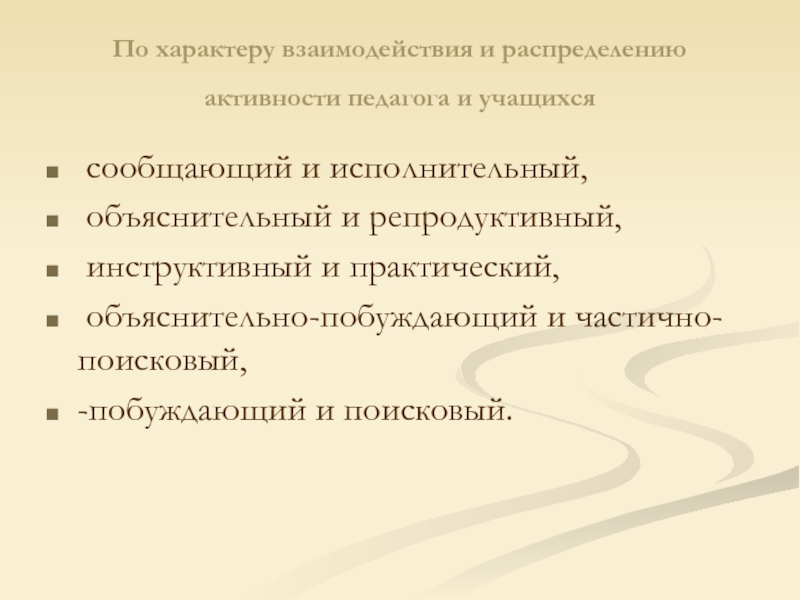 Слайд 8По характеру взаимодействия и распределению активности педагога и учащихся