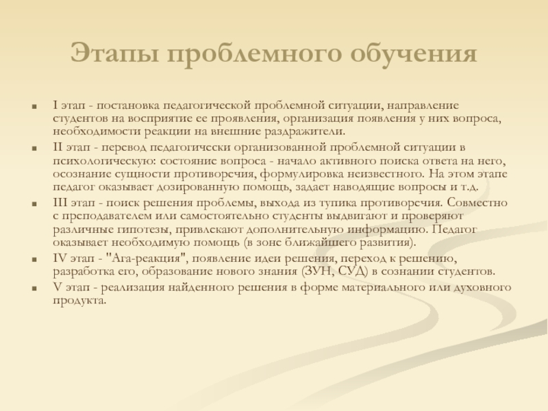 IV этап - "Ага-реакция", появление идеи решения, переход к решению, разработка его, образование нового знания (ЗУН, СУД) в сознании студентов.