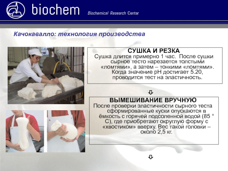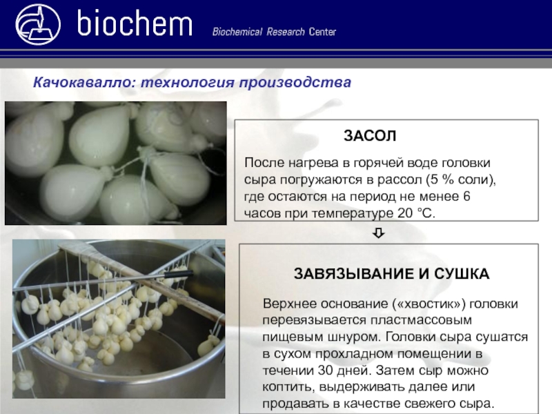 После проверки эластичности сырного теста сформированные куски опускаются в ёмкость с горячей подсоленной водой (85 °C), где приобретают округлую форму с «хвостиком» вверху. Вес такой головки – около 2,5 кг.