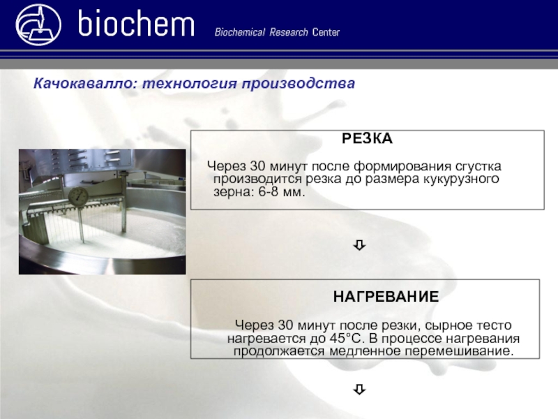 Через 30 минут после резки, сырное тесто нагревается до 45°C. В процессе нагревания продолжается медленное перемешивание.