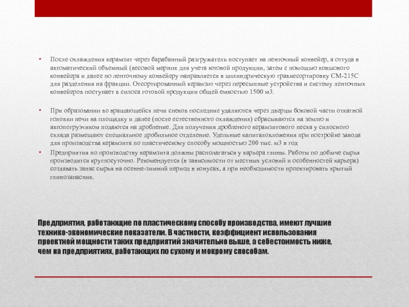 При образовании во вращающейся печи спеков последние удаляются через дверцы боковой части откатной головки печи на площадку и далее (после естественного охлаждения) сбрасываются на землю и автопогрузчиком подаются на дробление. Для получения дробленого керамзитового песка у силосного склада размещают специальное дробильное отделение. Удельные капиталовложения при постройке завода для производства керамзита по пластическому способу мощностью 200 тыс. м3 в год