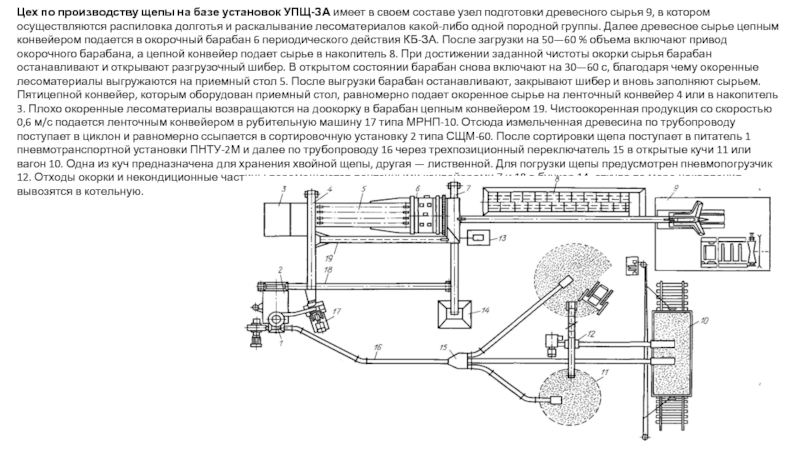 составе узел подготовки древесного сырья 9, в котором осуществляются распиловка долготья и раскалывание лесоматериалов какой-либо одной породной группы. Далее древесное сырье цепным конвейером подается в окорочный барабан 6 периодического действия КБ-ЗА. После загрузки на 50—60 % объема включают привод окорочного барабана, а цепной конвейер подает сырье в накопитель 8. При достижении заданной чистоты окорки сырья барабан останавливают и открывают разгрузочный шибер. В открытом состоянии барабан снова включают на 30—60 с, благодаря чему окоренные лесоматериалы выгружаются на приемный стол 5. После выгрузки барабан останавливают, закрывают шибер и вновь заполняют сырьем. Пятицепной конвейер, которым оборудован приемный стол, равномерно подает окоренное сырье на ленточный конвейер 4 или в накопитель 3. Плохо окоренные лесоматериалы возвращаются на доокорку в барабан цепным конвейером 19. Чистоокоренная продукция со скоростью 0,6 м/с подается ленточным конвейером в рубительную машину 17 типа МРНП-10. Отсюда измельченная древесина по трубопроводу поступает в циклон и равномерно ссыпается в сортировочную установку 2 типа СЩМ-60. После сортировки щепа поступает в питатель 1 пневмотранспортной установки ПНТУ-2М и далее по трубопроводу 16 через трехпозиционный переключатель 15 в открытые кучи 11 или вагон 10. Одна из куч предназначена для хранения хвойной щепы, другая — лиственной. Для погрузки щепы предусмотрен пневмопогрузчик 12. Отходы окорки и некондиционные частицы перемещаются ленточными конвейерами 7 и 18 в бункер 14, откуда по мере накопления вывозятся в котельную.