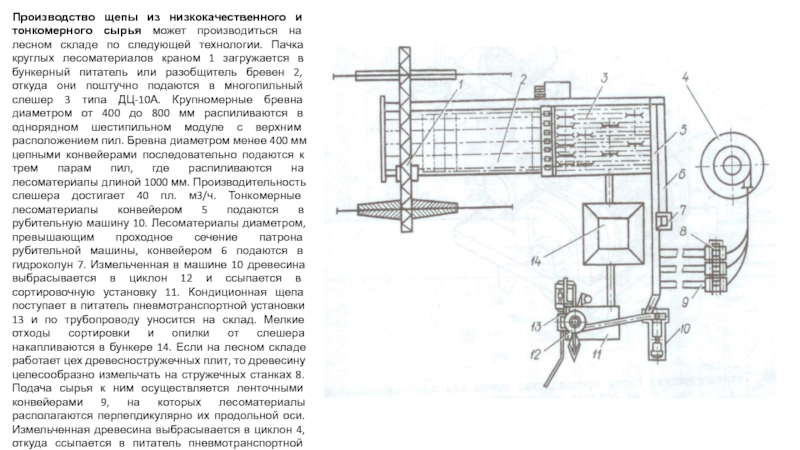 складе по следующей технологии. Пачка круглых лесоматериалов краном 1 загружается в бункерный питатель или разобщитель бревен 2, откуда они поштучно подаются в многопильный слешер 3 типа ДЦ-10А. Крупномерные бревна диаметром от 400 до 800 мм распиливаются в однорядном шестипильном модуле с верхним расположением пил. Бревна диаметром менее 400 мм цепными конвейерами последовательно подаются к трем парам пил, где распиливаются на лесоматериалы длиной 1000 мм. Производительность слешера достигает 40 пл. м3/ч. Тонкомерные лесоматериалы конвейером 5 подаются в рубительную машину 10. Лесоматериалы диаметром, превышающим проходное сечение патрона рубительной машины, конвейером 6 подаются в гидроколун 7. Измельченная в машине 10 древесина выбрасывается в циклон 12 и ссыпается в сортировочную установку 11. Кондиционная щепа поступает в питатель пневмотранспортной установки 13 и по трубопроводу уносится на склад. Мелкие отходы сортировки и опилки от слешера накапливаются в бункере 14. Если на лесном складе работает цех древесностружечных плит, то древесину целесообразно измельчать на стружечных станках 8. Подача сырья к ним осуществляется ленточными конвейерами 9, на которых лесоматериалы располагаются перпепдикулярно их продольной оси. Измельченная древесина выбрасывается в циклон 4, откуда ссыпается в питатель пневмотранспортной установки и перемещается на промежуточный склад.