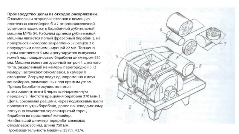 ленточных конвейеров б и 7 от раскряжевочной установки подаются к барабанной рубительной машине МРБ-04. Рабочим органом рубительной машины является полый фрезерный барабан 1, на поверхности которого закреплено 37 резцов 2 с полукруглым лезвием шириной 22 мм. Толщина щепы составляет 5 мм и регулируется выпуском ножей над поверхностью барабана диаметром 950 мм. Машина имеет загрузочный патрон 4 шахтного типа, разделенный на камеры перегородкой 5. В камеру I загружают откомлевки, в камеру II оторцовки. Загрузку ведут одновременно с двух конвейеров, размещенных под прямым углом. Привод барабана осуществляется электродвигателем 8 через клиноременную передачу 3. Частота вращения барабана 370 мин-1. Щепа, срезаемая резцами, через подножевые щели проходит внутрь барабана, далее по неподвижному лотку она ссыпается через открытый торец барабана на приставной конвейер.