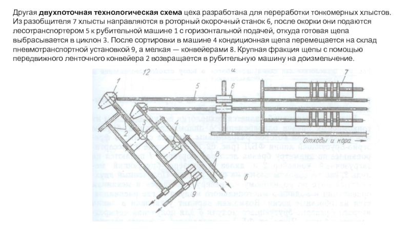 Слайд 8Другая двухпоточная технологическая схема цеха разработана для переработки тонкомерных хлыстов. Из