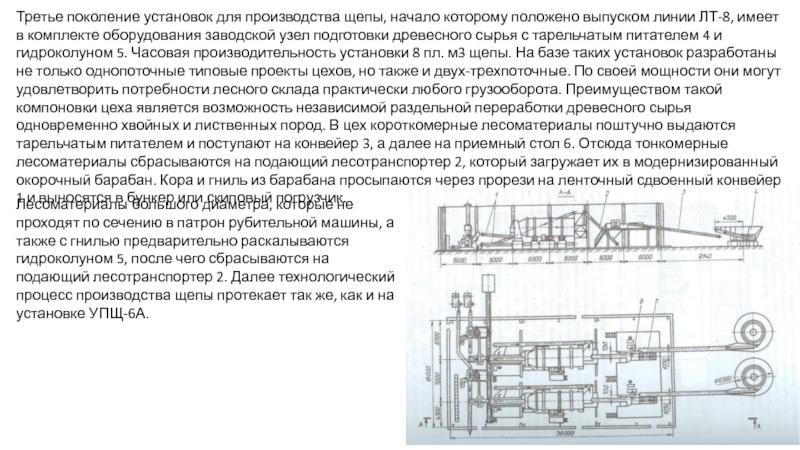 ЛТ-8, имеет в комплекте оборудования заводской узел подготовки древесного сырья с тарельчатым питателем 4 и гидроколуном 5. Часовая производительность установки 8 пл. м3 щепы. На базе таких установок разработаны не только однопоточные типовые проекты цехов, но также и двух-трехпоточные. По своей мощности они могут удовлетворить потребности лесного склада практически любого грузооборота. Преимуществом такой компоновки цеха является возможность независимой раздельной переработки древесного сырья одновременно хвойных и лиственных пород. В цех короткомерные лесоматериалы поштучно выдаются тарельчатым питателем и поступают на конвейер 3, а далее на приемный стол 6. Отсюда тонкомерные лесоматериалы сбрасываются на подающий лесотранспортер 2, который загружает их в модернизированный окорочный барабан. Кора и гниль из барабана просыпаются через прорези на ленточный сдвоенный конвейер 1 и выносятся в бункер или скиповый погрузчик.