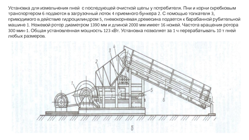 и корни скребковым транспортером 6 подаются в загрузочный лоток 4 приемного бункера 2. С помощью толкателя 3, приводимого в действие гидроцилиндром 5, пневокорневая древесина подается к барабанной рубительной машине 1. Ножевой ротор диаметром 1390 мм и длиной 2000 мм имеет 16 ножей. Частота вращения ротора 300 мин-1. Общая установленная мощность 123 кВт. Установка позволяет за 1 ч перерабатывать 10 т пней любых размеров.