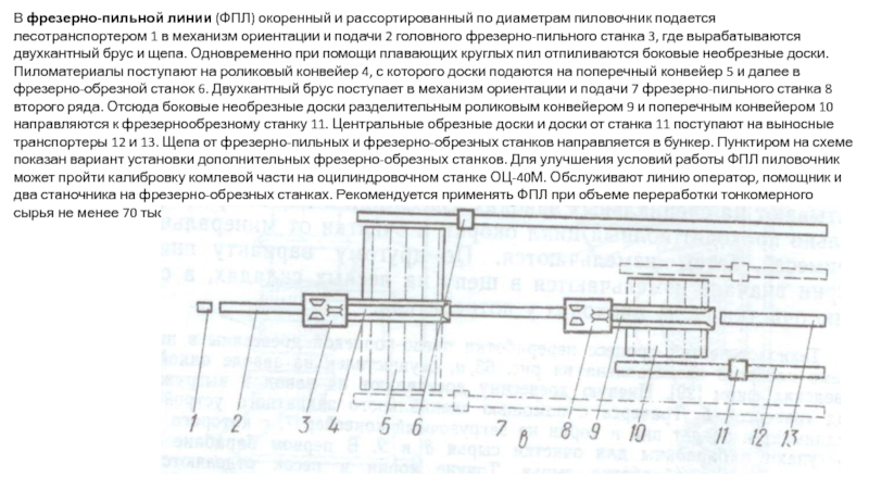 лесотранспортером 1 в механизм ориентации и подачи 2 головного фрезерно-пильного станка 3, где вырабатываются двухкантный брус и щепа. Одновременно при помощи плавающих круглых пил отпиливаются боковые необрезные доски. Пиломатериалы поступают на роликовый конвейер 4, с которого доски подаются на поперечный конвейер 5 и далее в фрезерно-обрезной станок 6. Двухкантный брус поступает в механизм ориентации и подачи 7 фрезерно-пильного станка 8 второго ряда. Отсюда боковые необрезные доски разделительным роликовым конвейером 9 и поперечным конвейером 10 направляются к фрезернообрезному станку 11. Центральные обрезные доски и доски от станка 11 поступают на выносные транспортеры 12 и 13. Щепа от фрезерно-пильных и фрезерно-обрезных станков направляется в бункер. Пунктиром на схеме показан вариант установки дополнительных фрезерно-обрезных станков. Для улучшения условий работы ФПЛ пиловочник может пройти калибровку комлевой части на оцилиндровочном станке ОЦ-40М. Обслуживают линию оператор, помощник и два станочника на фрезерно-обрезных станках. Рекомендуется применять ФПЛ при объеме переработки тонкомерного сырья не менее 70 тыс. м3 в год.