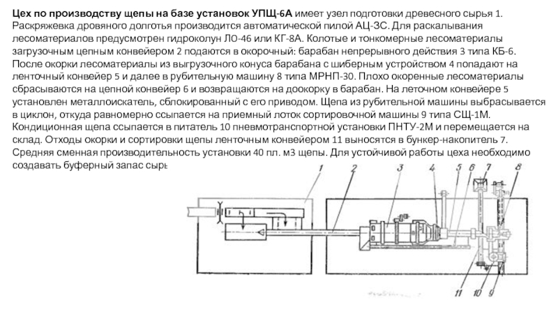 древесного сырья 1. Раскряжевка дровяного долготья производится автоматической пилой АЦ-ЗС. Для раскалывания лесоматериалов предусмотрен гидроколун ЛO-46 или КГ-8А. Колотые и тонкомерные лесоматериалы загрузочным цепным конвейером 2 подаются в окорочный: барабан непрерывного действия 3 типа КБ-6. После окорки лесоматериалы из выгрузочного конуса барабана с шиберным устройством 4 попадают на ленточный конвейер 5 и далее в рубительную машину 8 типа МРНП-30. Плохо окоренные лесоматериалы сбрасываются на цепной конвейер 6 и возвращаются на доокорку в барабан. На леточном конвейере 5 установлен металлоискатель, сблокированный с его приводом. Щепа из рубительной машины выбрасывается в циклон, откуда равномерно ссыпается на приемный лоток сортировочной машины 9 типа СЩ-1М. Кондиционная щепа ссыпается в питатель 10 пневмотранспортной установки ПНТУ-2М и перемещается на склад. Отходы окорки и сортировки щепы ленточным конвейером 11 выносятся в бункер-накопитель 7.