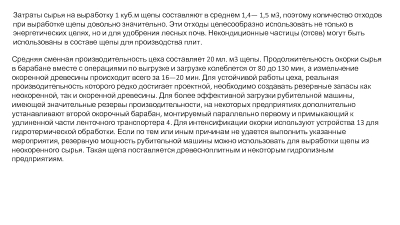 Слайд 4Средняя сменная производительность цеха составляет 20 мл. м3 щепы. Продолжительность окорки