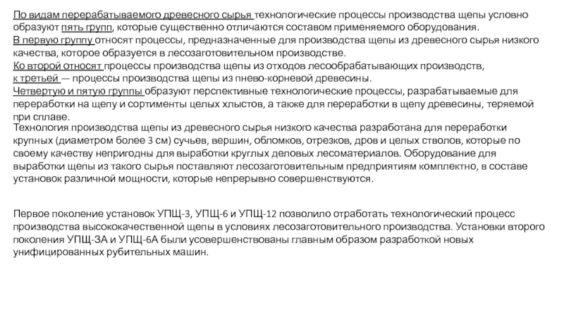 В первую группу относят процессы, предназначенные для производства щепы из древесного сырья низкого качества, которое образуется в лесозаготовительном производстве.