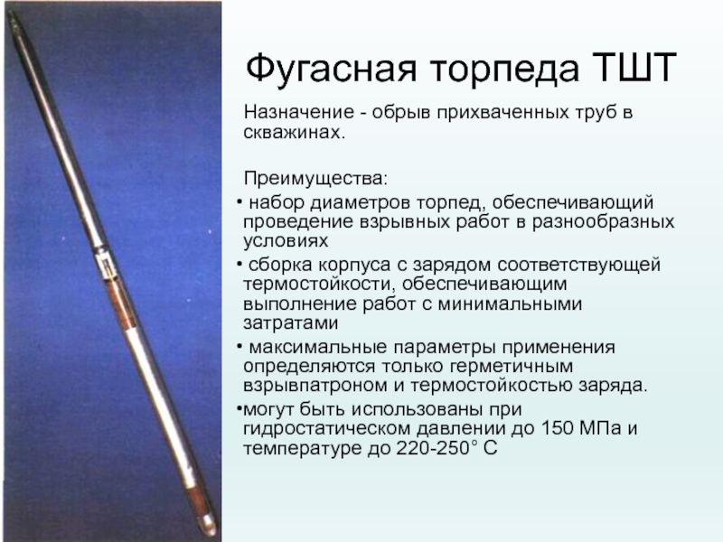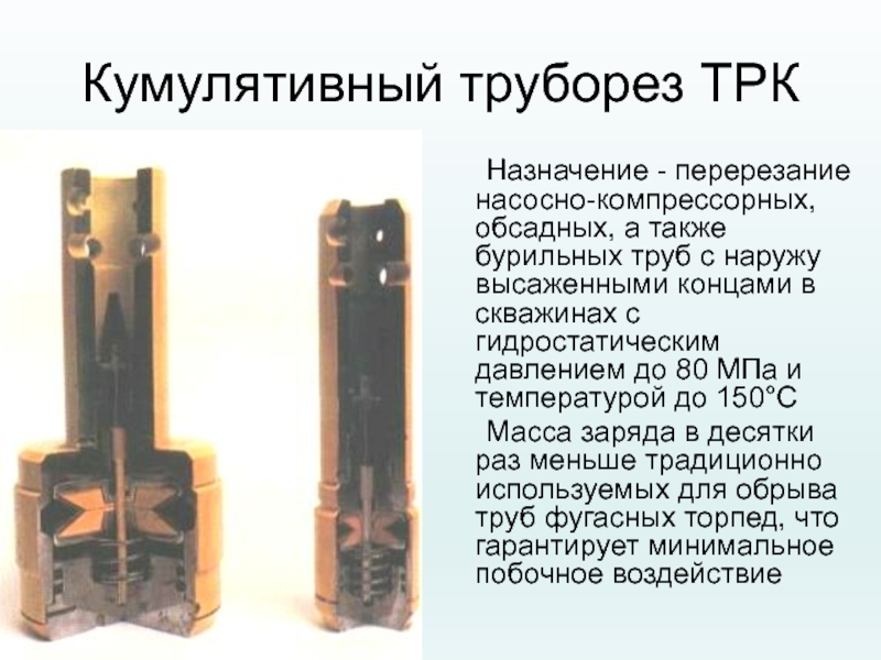 Масса заряда в десятки раз меньше традиционно используемых для обрыва труб фугасных торпед, что гарантирует минимальное побочное воздействие