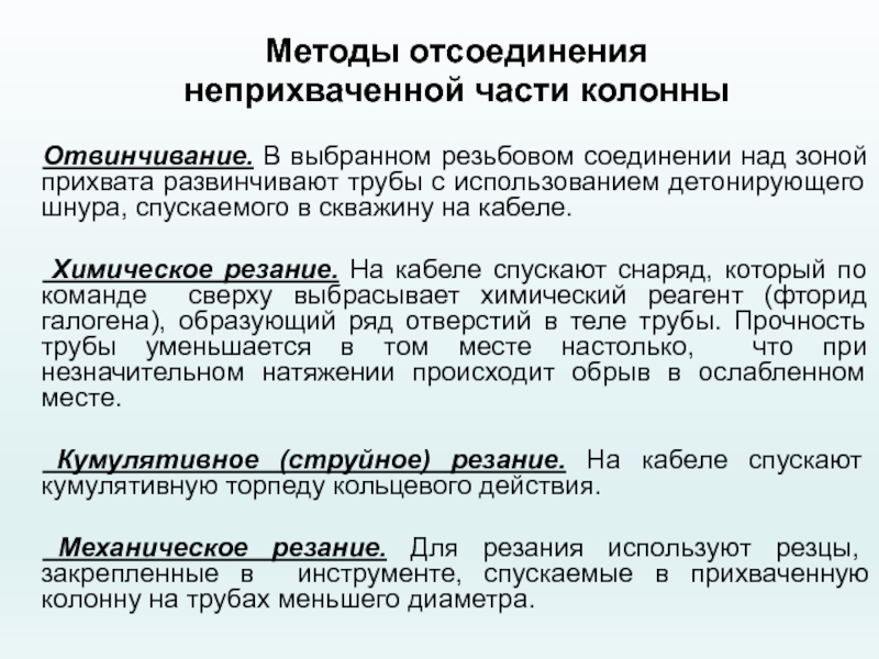 Химическое резание. На кабеле спускают снаряд, который по команде сверху выбрасывает химический реагент (фторид галогена), образующий ряд отверстий в теле трубы. Прочность трубы уменьшается в том месте настолько, что при незначительном натяжении происходит обрыв в ослабленном месте.