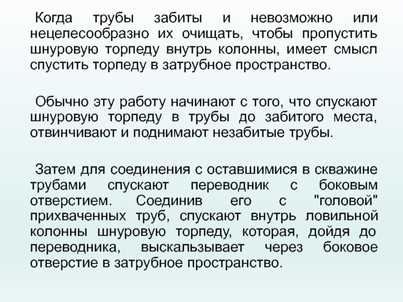 Обычно эту работу начинают с того, что спускают шнуровую торпеду в трубы до забитого места, отвинчивают и поднимают незабитые трубы.