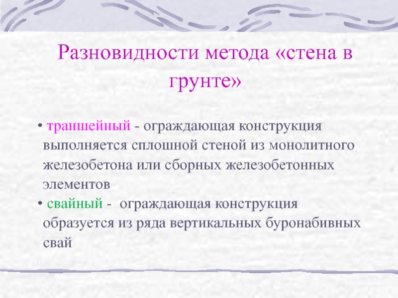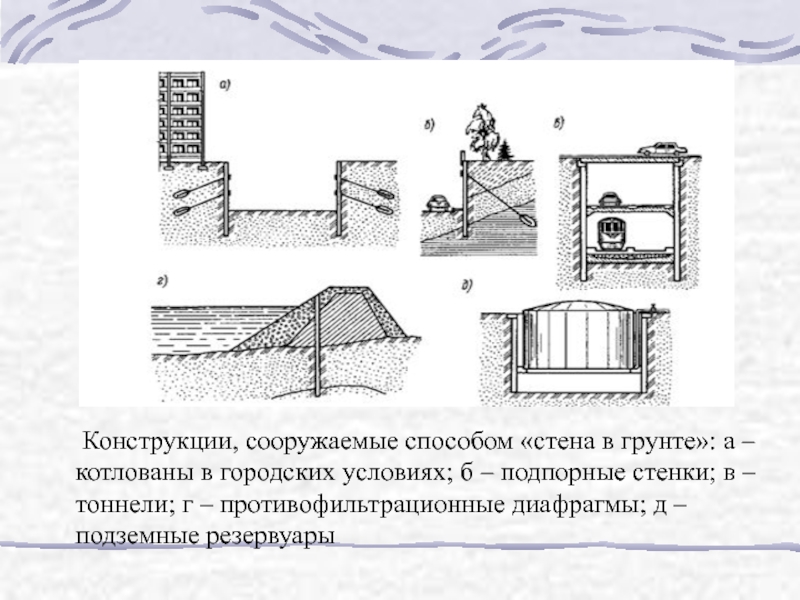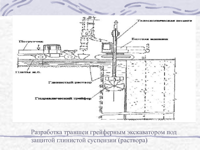Слайд 107Железобетонные и бетонные стены в траншее, заполненной суспензией, бетонируют методами подводного