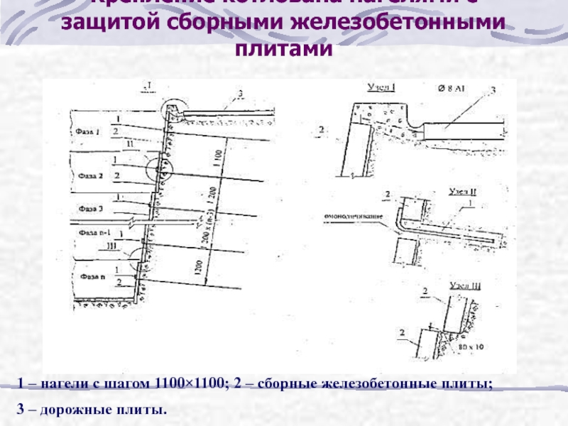 Слайд 38Крепление котлована нагелями с защитой сборными железобетонными плитами