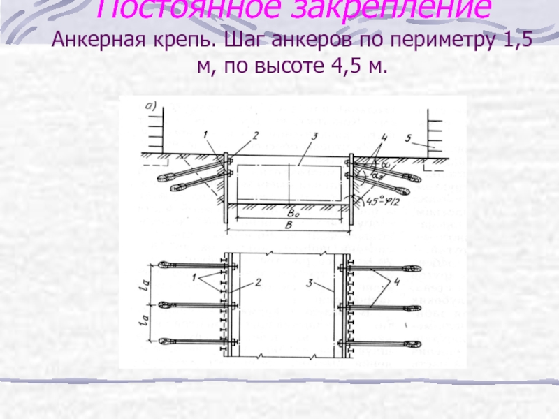 Слайд 27Постоянное закрепление Анкерная крепь. Шаг анкеров по периметру 1,5 м, по