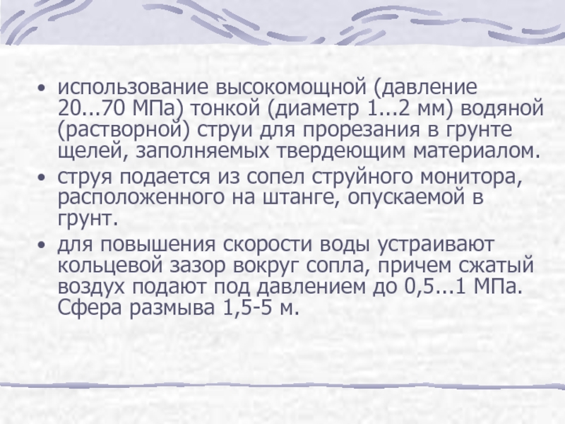 Слайд 116использование высокомощной (давление 20...70 МПа) тонкой (диаметр 1...2 мм) водяной (растворной)