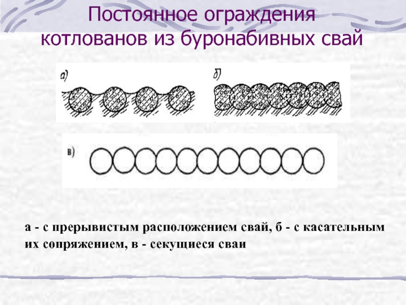 а - с прерывистым расположением свай, б - с касательным их сопряжением, в - секущиеся сваи