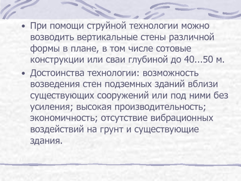 Достоинства технологии: возможность возведения стен подземных зданий вблизи существующих сооружений или под ними без усиления; высокая производительность; экономичность; отсутствие вибрационных воздействий на грунт и существующие здания.