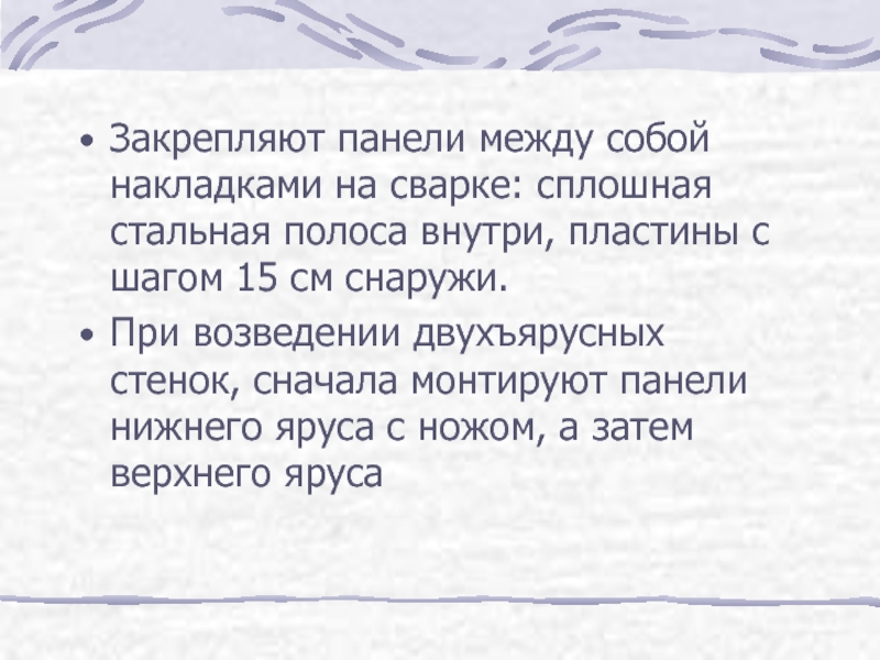 панель устанавливают с тщательной выверкой, а вторую и последующие - с помощью специальных монтажных приспособлений и кондукторов, после чего заполняют или тампонируют пазухи.