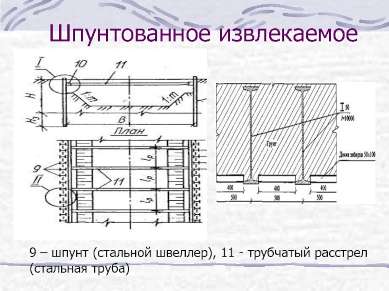 9 – шпунт (стальной швеллер), 11 - трубчатый расстрел (стальная