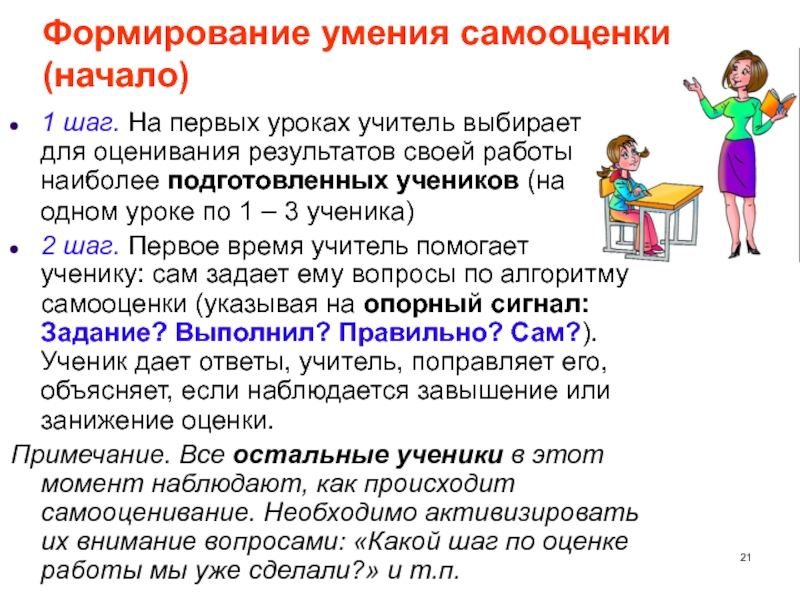 ученику: сам задает ему вопросы по алгоритму самооценки (указывая на опорный сигнал: Задание? Выполнил? Правильно? Сам?). Ученик дает ответы, учитель, поправляет его, объясняет, если наблюдается завышение или занижение оценки.