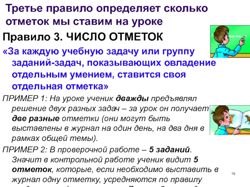 За каждую задачу проверочной (контрольной) работы по итогам темы отметка ставится всем ученикам, так как каждый должен показать, как он овладел умениями и знаниями темы. Ученик не может отказаться от выставления этой отметки, но имеет право пересдать (хотя бы один раз) не устраивающую его отметку