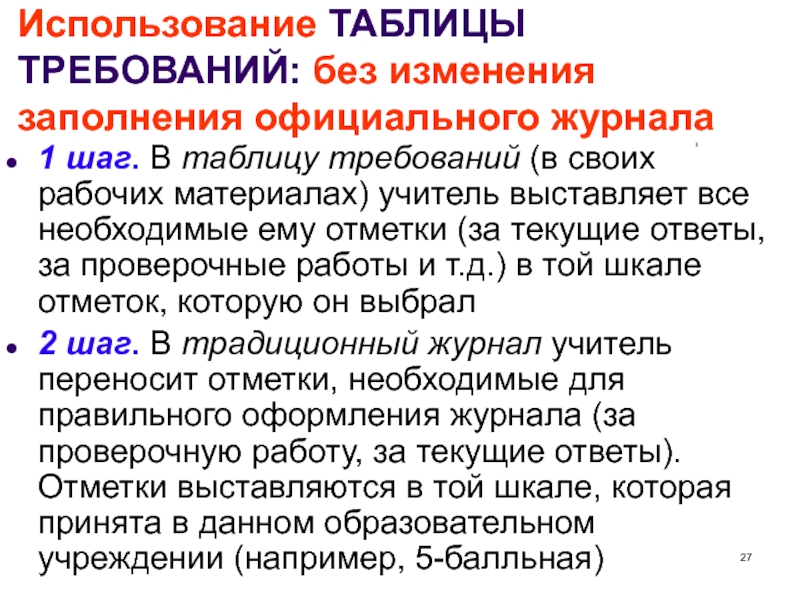 Слайд 27Использование ТАБЛИЦЫ ТРЕБОВАНИЙ: без изменения заполнения официального журнала