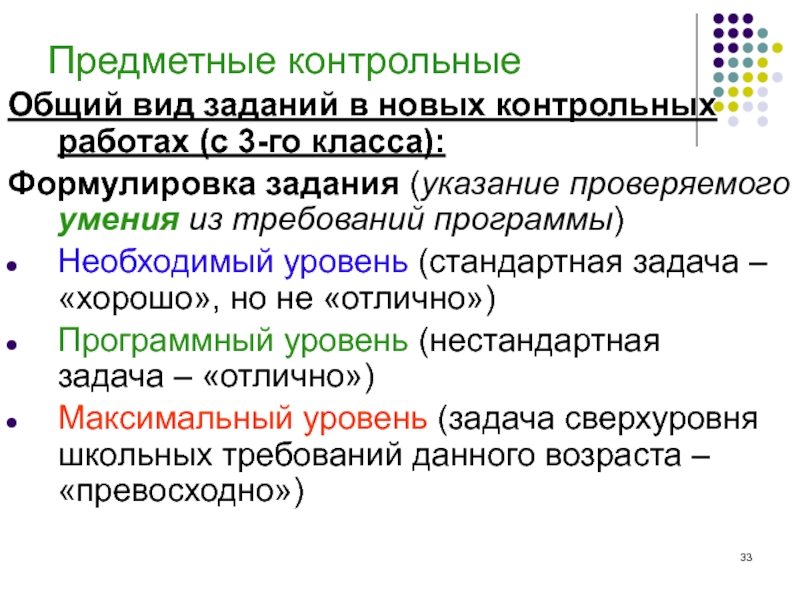 Максимальный уровень (необязательный) – решение «сверхзадачи» по неизученному материалу, когда потребовались либо самостоятельно добытые вне уроков знания, либо новые самостоятельно усвоенные умения. Этот уровень демонстрирует исключительные успехи отдельных учеников по отдельным темам – сверх школьных требований, «превосходно»