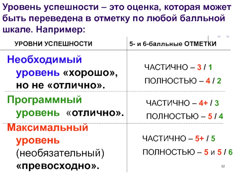 Слайд 32Уровень успешности – это оценка, которая может быть переведена в отметку