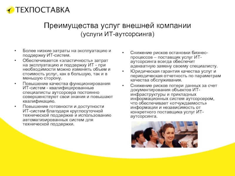 Снижение рисков остановки бизнес-процессов – поставщик услуг ИТ-аутсорсинга всегда обеспечит адекватную замену своему специалисту.