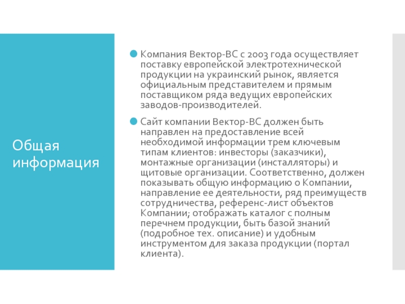 Сайт компании Вектор-ВС должен быть направлен на предоставление всей необходимой информации трем ключевым типам клиентов: инвесторы (заказчики), монтажные организации (инсталляторы) и щитовые организации. Соответственно, должен показывать общую информацию о Компании, направление ее деятельности, ряд преимуществ сотрудничества, референс-лист объектов Компании; отображать каталог с полным перечнем продукции, быть базой знаний (подробное тех. описание) и удобным инструментом для заказа продукции (портал клиента).