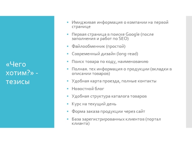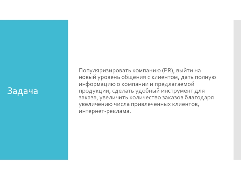 полную информацию о компании и предлагаемой продукции, сделать удобный инструмент для заказа, увеличить количество заказов благодаря увеличению числа привлеченных клиентов, интернет-реклама.
