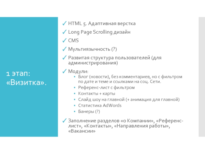 Заполнение разделов «о Компании», «Референс-лист», «Контакты», «Направления работы», «Вакансии»
