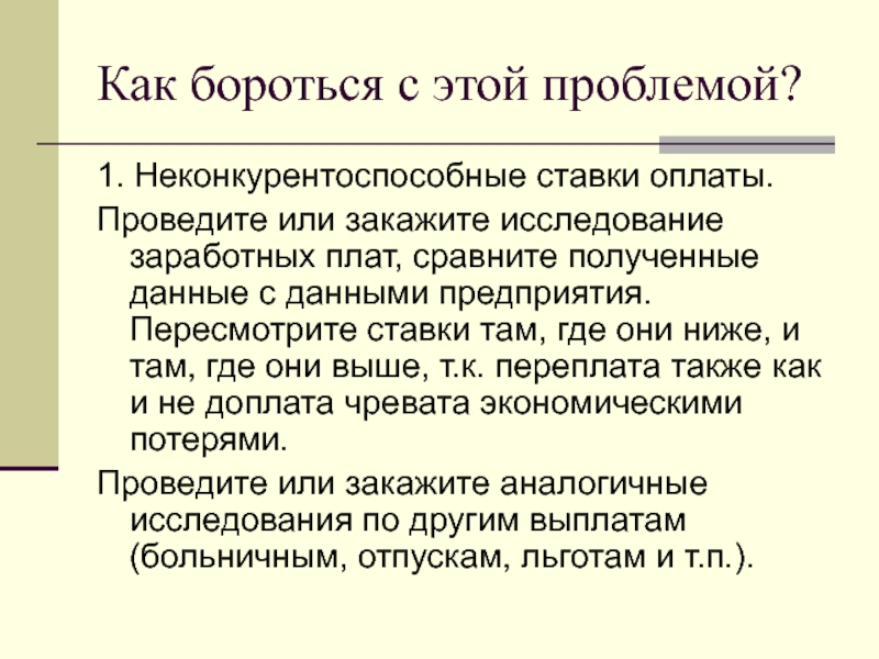исследование заработных плат, сравните полученные данные с данными предприятия. Пересмотрите ставки там, где они ниже, и там, где они выше, т.к. переплата также как и не доплата чревата экономическими потерями.