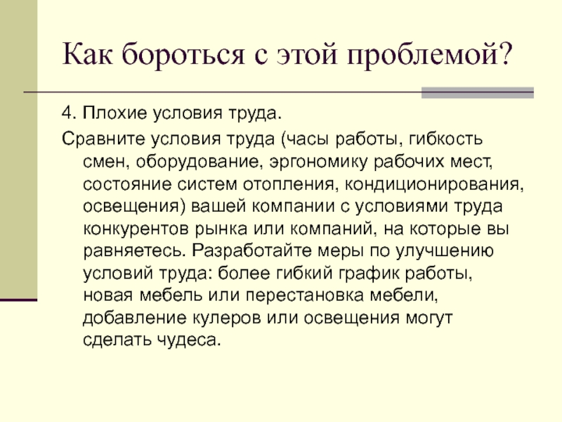 (часы работы, гибкость смен, оборудование, эргономику рабочих мест, состояние систем отопления, кондиционирования, освещения) вашей компании с условиями труда конкурентов рынка или компаний, на которые вы равняетесь. Разработайте меры по улучшению условий труда: более гибкий график работы, новая мебель или перестановка мебели, добавление кулеров или освещения могут сделать чудеса.