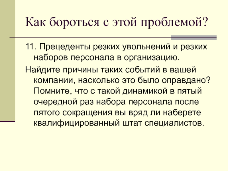 Найдите причины таких событий в вашей компании, насколько это было оправдано? Помните, что с такой динамикой в пятый очередной раз набора персонала после пятого сокращения вы вряд ли наберете квалифицированный штат специалистов.
