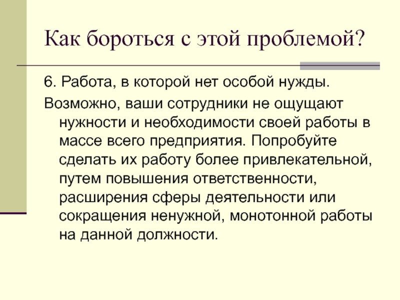 Возможно, ваши сотрудники не ощущают нужности и необходимости своей работы в массе всего предприятия. Попробуйте сделать их работу более привлекательной, путем повышения ответственности, расширения сферы деятельности или сокращения ненужной, монотонной работы на данной должности.