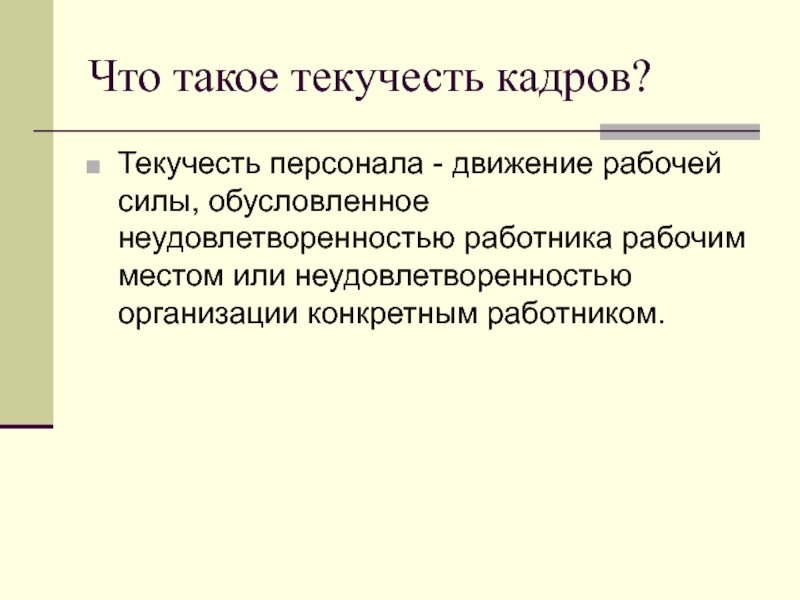 отношение числа уволенных работников предприятия, выбывших за данный период по причинам текучести (по собственному желанию, за прогулы, за нарушение техники безопасности, самовольный уход и т.п. причинам, не вызванным производственной или общегосударственной потребностью) к среднесписочной численности за тот же период.
