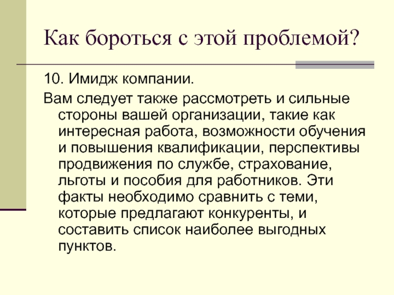 и сильные стороны вашей организации, такие как интересная работа, возможности обучения и повышения квалификации, перспективы продвижения по службе, страхование, льготы и пособия для работников. Эти факты необходимо сравнить с теми, которые предлагают конкуренты, и составить список наиболее выгодных пунктов.