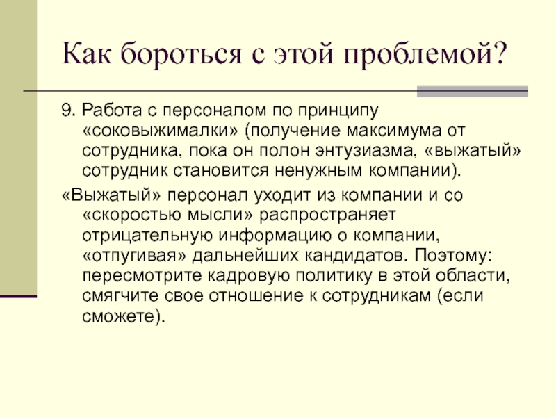 «Выжатый» персонал уходит из компании и со «скоростью мысли» распространяет отрицательную информацию о компании, «отпугивая» дальнейших кандидатов. Поэтому: пересмотрите кадровую политику в этой области, смягчите свое отношение к сотрудникам (если сможете).